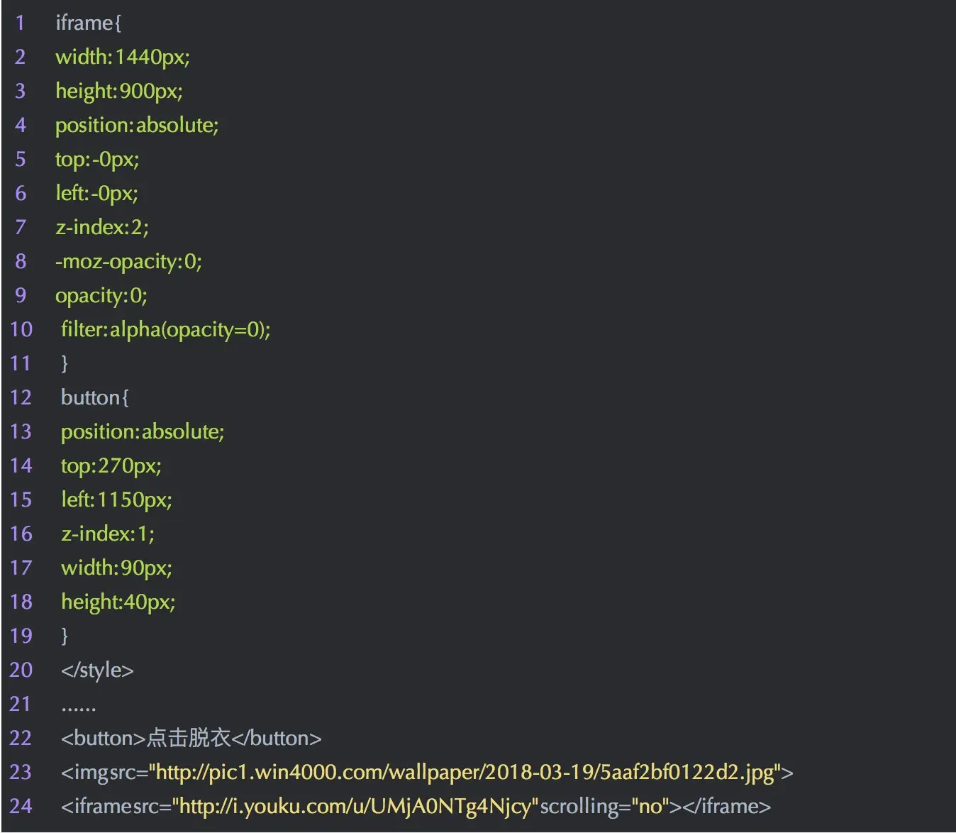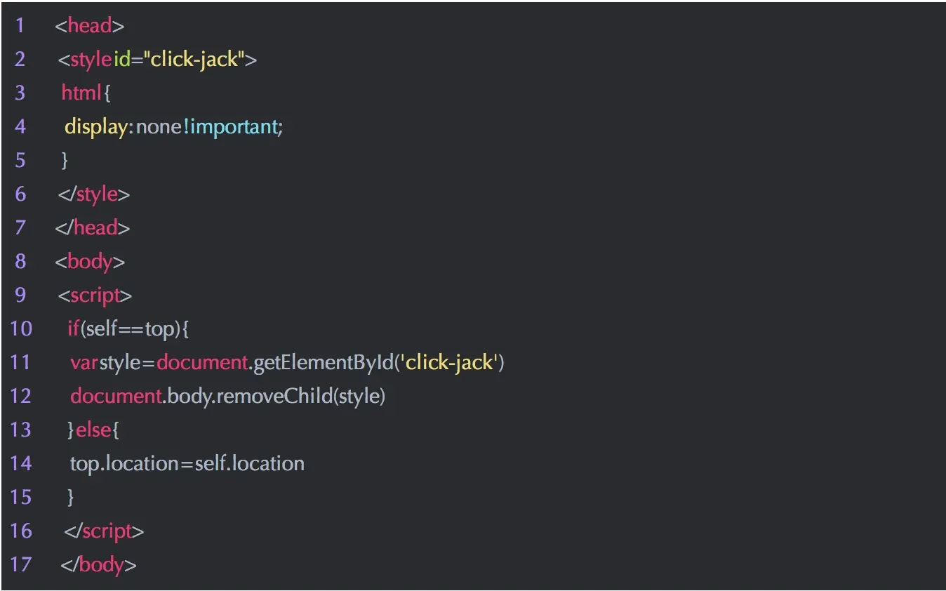 以上代码的作用就是当通过 iframe 的方式加载页面时,攻击者的网页直接不显示所有内容了。