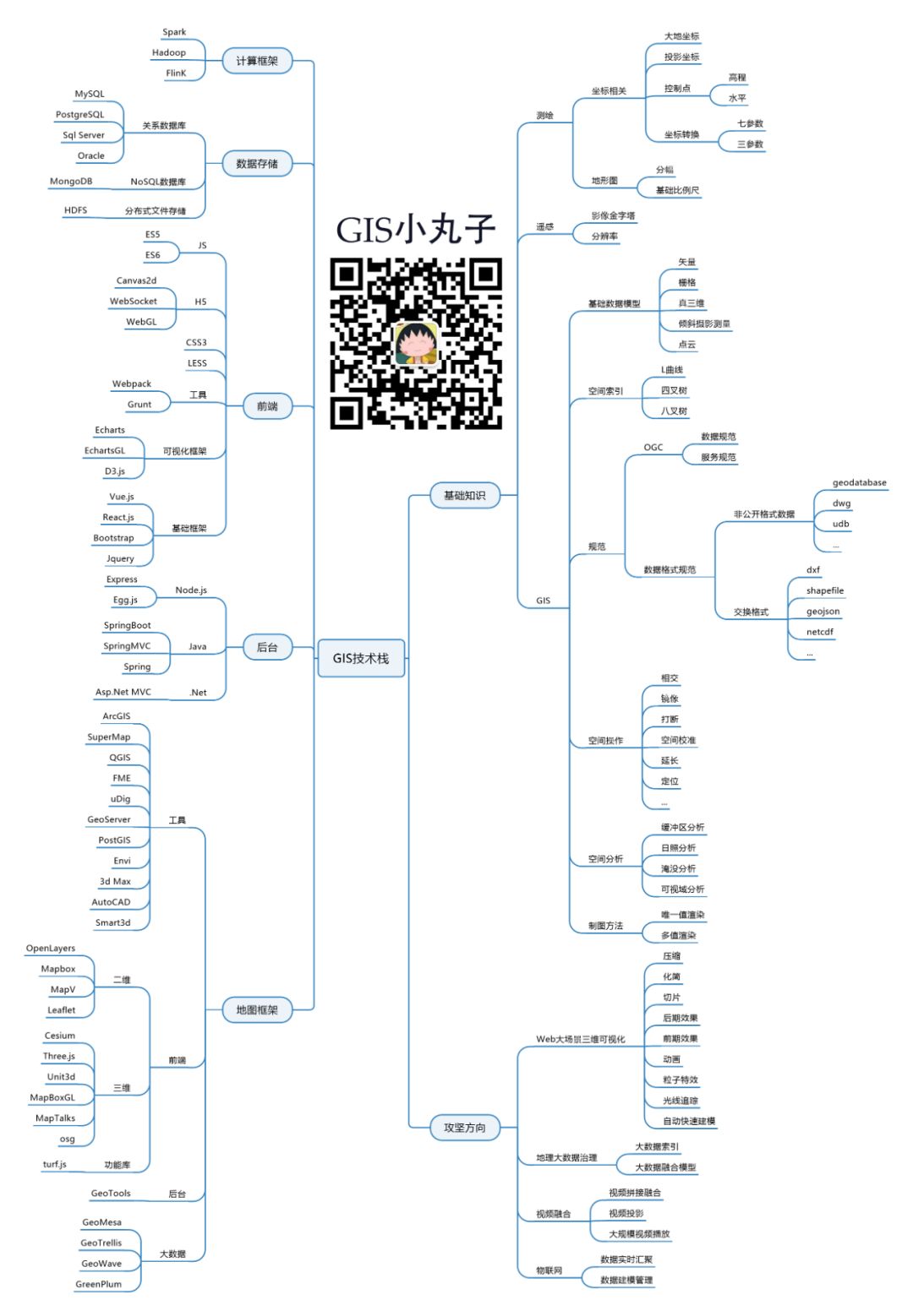 结合今天的经历,回归到初心,我希望我做的这个小东西能够帮到后来人,让这个行业有持续不断的新鲜血液补充进来,消除他们的迷惑,因而以后“GIS小丸子”上会多放一些关于职业&行业相关的东西,不是帮你分析,能做到只是把这些不同的经历摆在这边,你们结合自己的定位自己选择~~,另外我还整理了一张GIS技术栈的脑图作为结尾,同时希望更多的过来人能加入进来,让信息更加丰富起来,毕竟我的知识和经历也是有限的~~~