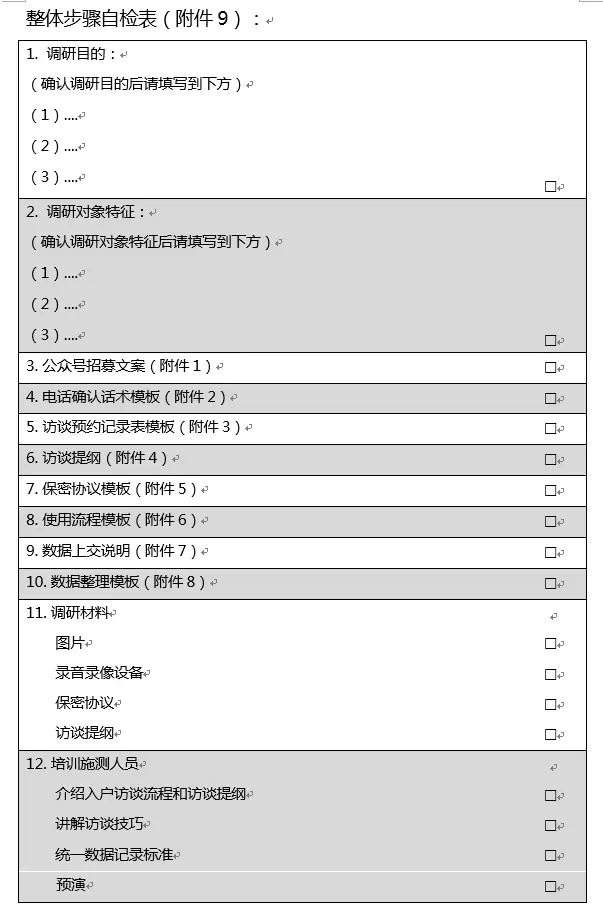 将整个调研需要用到的表格资料整理成册,并制作一张“整体步骤自检表”,可以让你在调研的过程中进行自检,保证每一个步骤没有遗漏的信息,确保调研结果的完整性。
