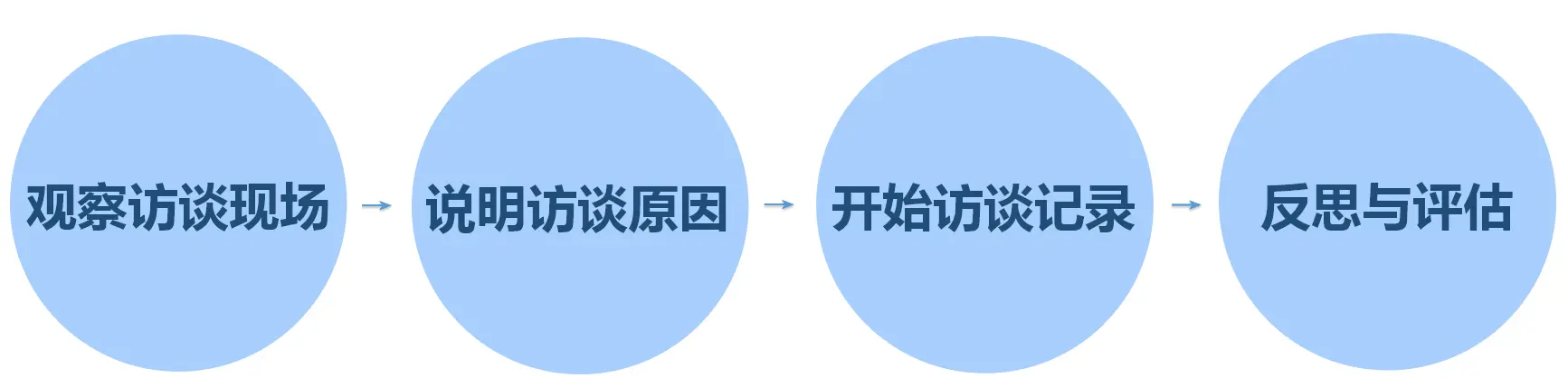 拥有一个完整的访谈提纲可以使访谈过程更加顺畅,增加我们对现场的把控程度。一般来说,访谈的步骤一般如下: