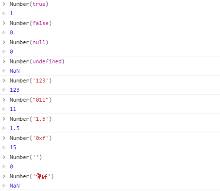4.如果为空字符串,转换为0,例:''转为0, 5.如果是除上述之外的字符,转换为NaN,例: