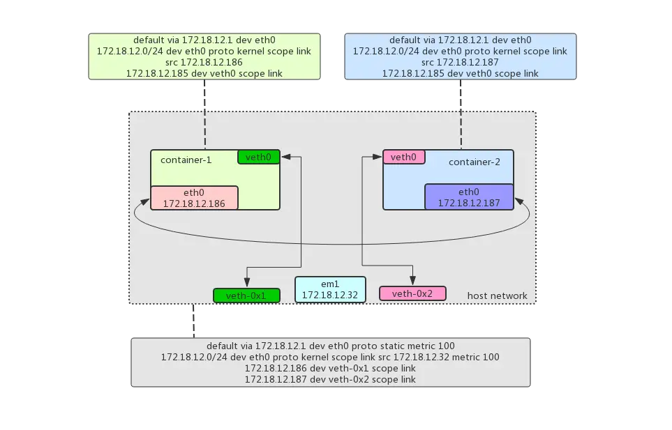 ①:借助 ipvlan 或 macvlan 在 em1 上创建2个虚拟⽹卡,然后分别加⼊到 container-1 和 container-2 中,容器内 ⽹卡命名为 eth0,且 IP地址 和宿主机平⾏。 ②:上⾯的操作完成后,容器之间可以互访,但是,容器和宿主机⽆法互访,这是 ipvlan/macvlan 的制约。 ③:创建 2 个 veth-pair 对,⼀对加⼊宿主机和容器 container-1 中(容器端叫 veth0,宿主机端为 veth-0x1),另 外⼀对加⼊宿主机和容器 container-2 中(容器端叫 veth0,宿主机端为 veth-0x2),然后在容器内创建指向到宿 主机⽹卡的路由表规则,于此同时,在宿主机上,也要建⽴指向到容器⽹络的路由表规则。
