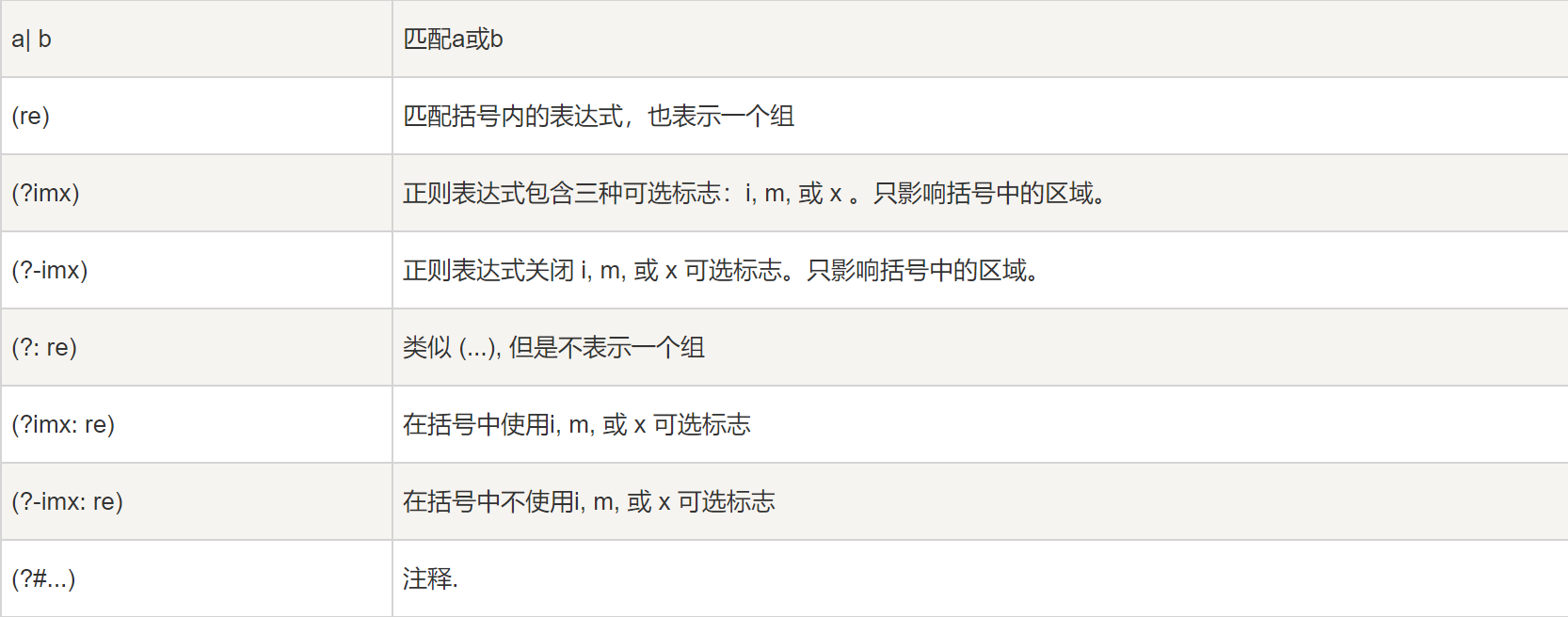 - re.match(pattern,string,flags=0) 只匹配字符串的开始 pattern:匹配的正则表达式;string:要匹配的字符串;flags:标志位