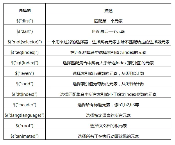 筛选选择器的用法与CSS中的伪元素相似,选择器用冒号“:”开头,筛选选择器很多都不是CSS的规范,而是jQuery自己为了开发者的便利延展出来的选择器。