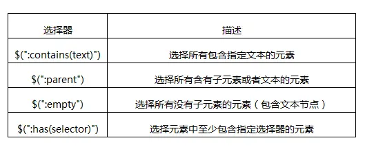 $(".div:contains(':contains')")$(".div:has(span)")$("a:parent")$("a:empty")- :contains与:has都有查找的意思,但是contains查找包含“指定文本”的元素,has查找包含“指定元素”的元素。