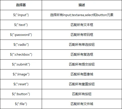 $(':input')$('input:text')$('input:password')$('input:radio')$('input:checkbox')$('input:submit')$('input:image')$('input:button') 表单对象属性筛选选择器也是专门针对表单元素的选择器,可以附加在其他选择器的后面,主要功能是对所选择的表单元素进行筛选。