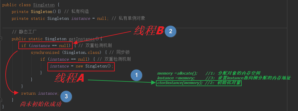 当线程 A 执行完1,3,时,准备走2,即 instance 对象还未完成初始化,但已经不再指向 null 。