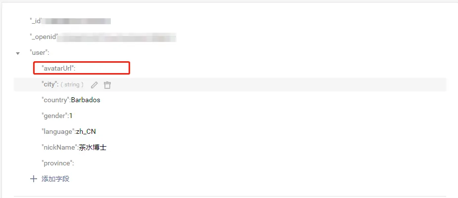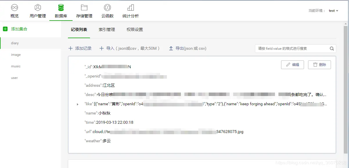 (5)、我们通过组件data中的imgUrl临时存储手动上传的图片路径,最终通过保存按钮一起存储到云数据库,存入到数据库是这样的: