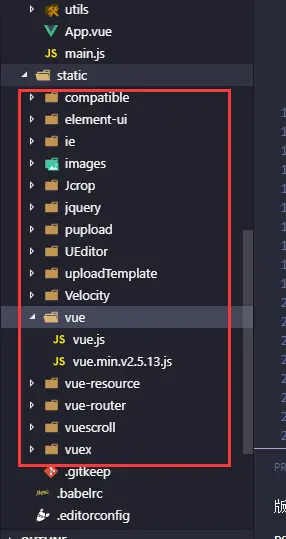 1、首先将这些静态库js文件加入到项目的static文件夹里面,例如下面的vue.js文件: