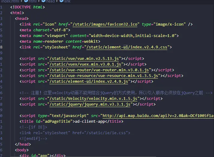 2、在项目根目录的index.html入口模板文件中采用传统的<script></script>
