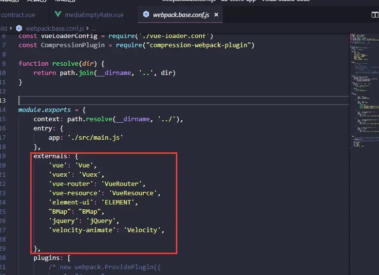 3、修改build\webpack.base.conf.js 文件,利用externals配置引用库,在module.exports中配置externals