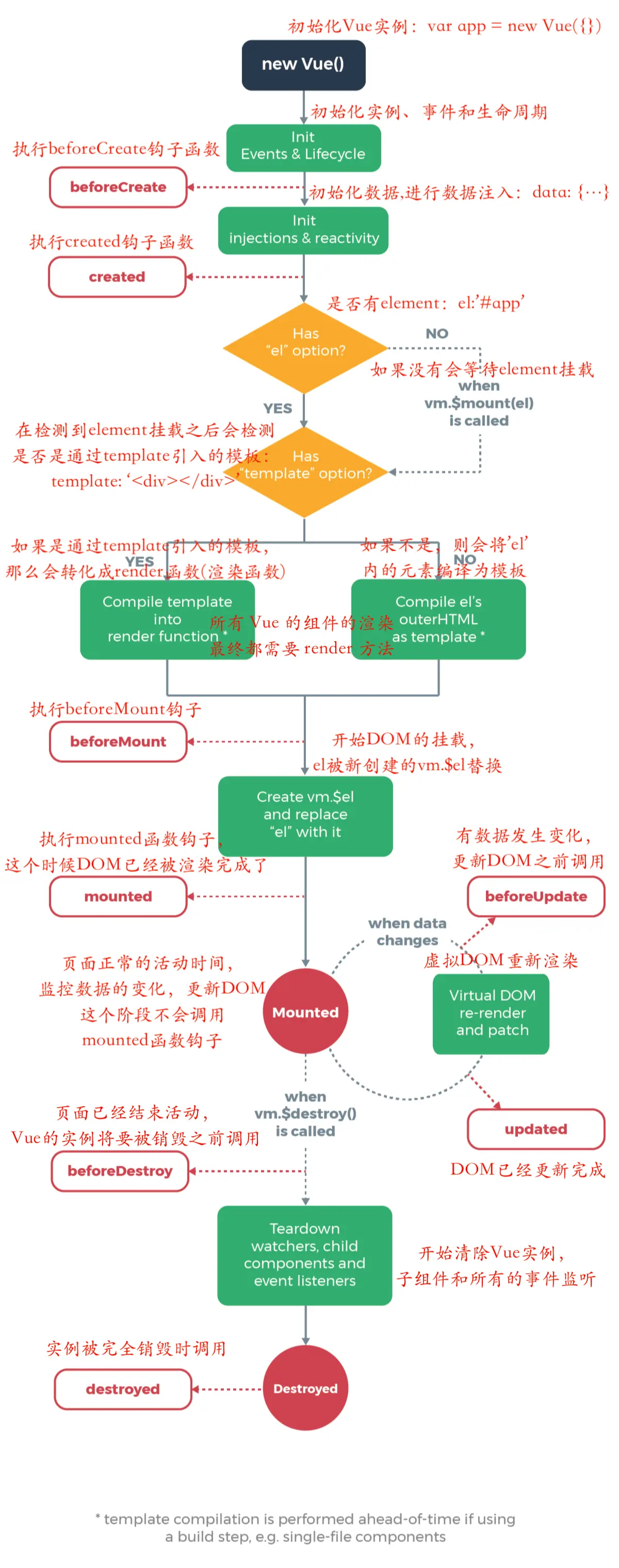 截止到目前Vue中所有的生命周期钩子我们都已经介绍完成了。下面再来一张完整的生命周期图: