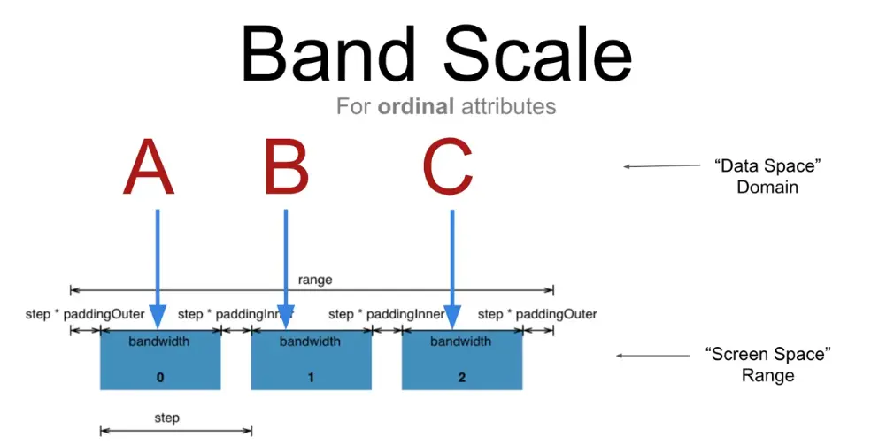 D3中有很多比例尺,本例中主要使用到了线性比例尺(scaleLinear)和序数比例尺(scaleBand)