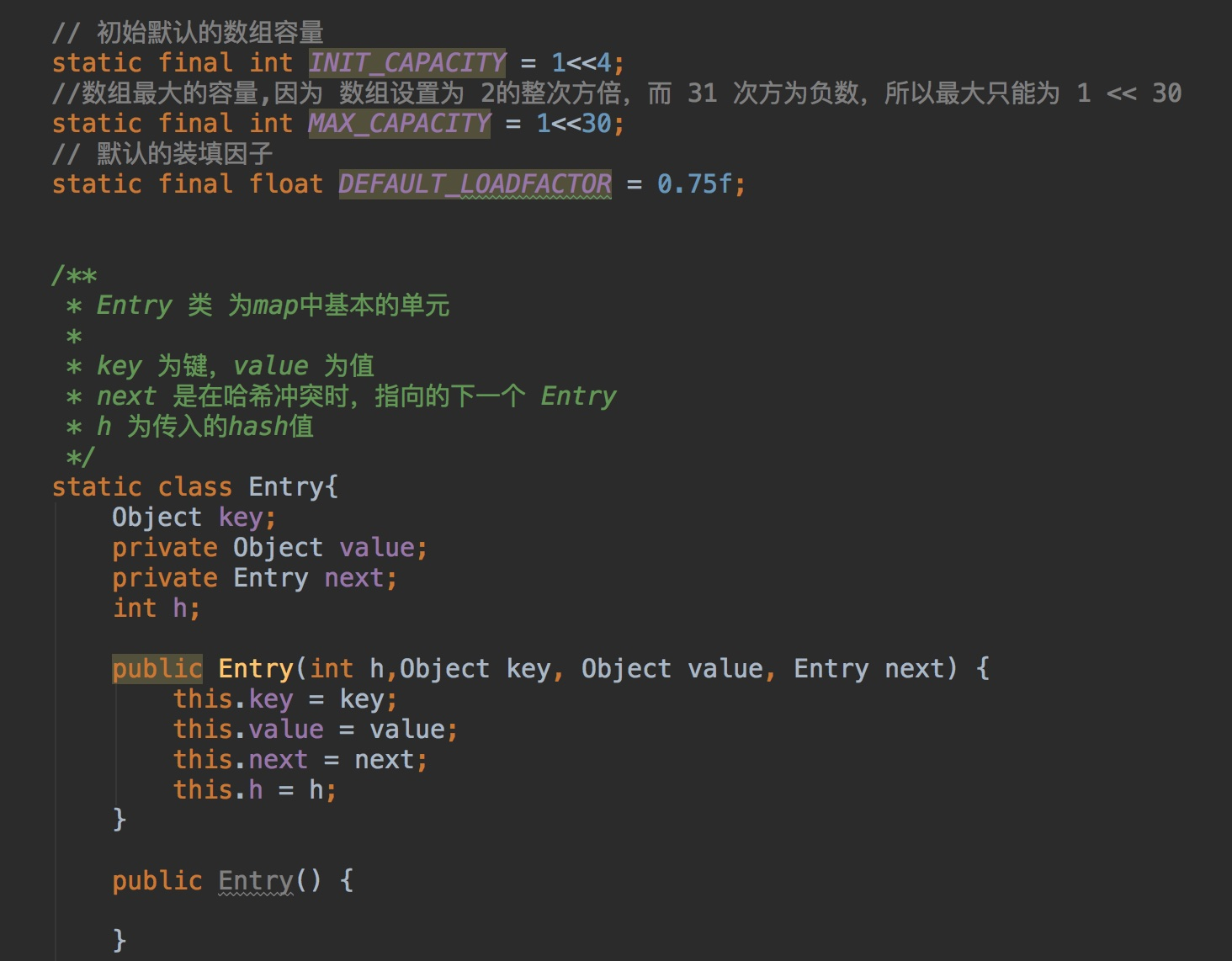 - 对于泛型K,V使用 Object代替,其他的关键字比如final,transient并没有写。因为这不是重点