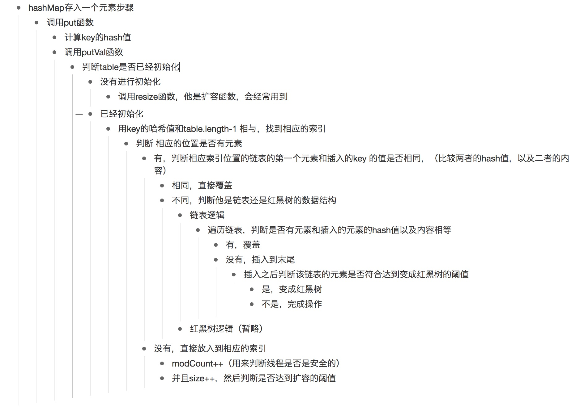 key值是否相等,相等的话,直接覆盖value,不相等的话遍历链表(红黑树),并插入到链表最后 - 在第二步的插入时,先判断 ++size是否已经大于了阈值,大于需要扩容。