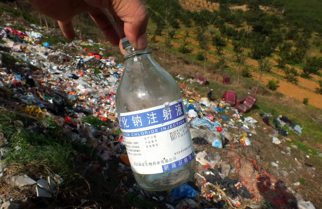 但在河南省濮阳县子岸乡、山东省郓城唐庙镇前厂村、陕西西安临潼区零口镇等等一些非正规处理医疗废物的小工厂内,却堆放着大量使用过的输液瓶、输液袋等医疗垃圾,他们利用这些医疗垃圾加工成破碎料,再经过简单的加工就可以变成白色塑料颗粒的再生料,然后这些再生料被大部分下游企业加工成织网袋、菜袋,甚至变成日用品或小孩子的玩具。