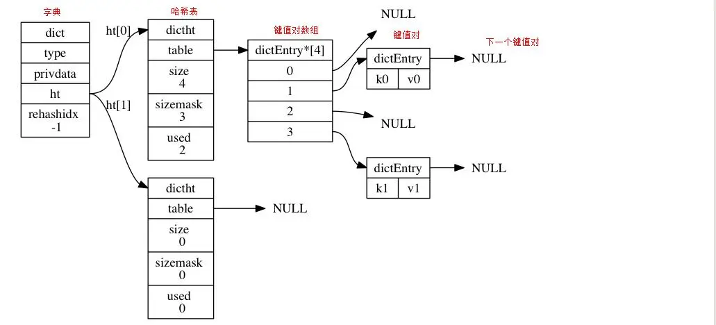 - 哈希表:和java中hashmap类似,table是用来存放键值对的数组,size是hash表大小,sizemask是用来进行取模运算用的,used表示目前存在键值对的索引数量