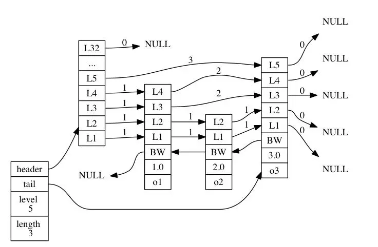 跳跃表是在链表的基础上采用分层的结构,和正常的链表不一样的是,跳跃列表的next指针是一个数组,一个节点可以指向多个next,并且对应不同测层次。节点代码如下