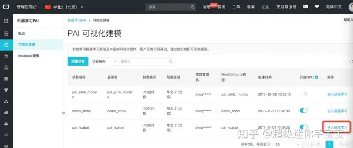 如下图示,在阿里云机器学习平台开通账号之后,进入管理控制台—可视化建模,根据自己的需要新建项目,进入机器学习即可进入到PAI-Studio进行使用。