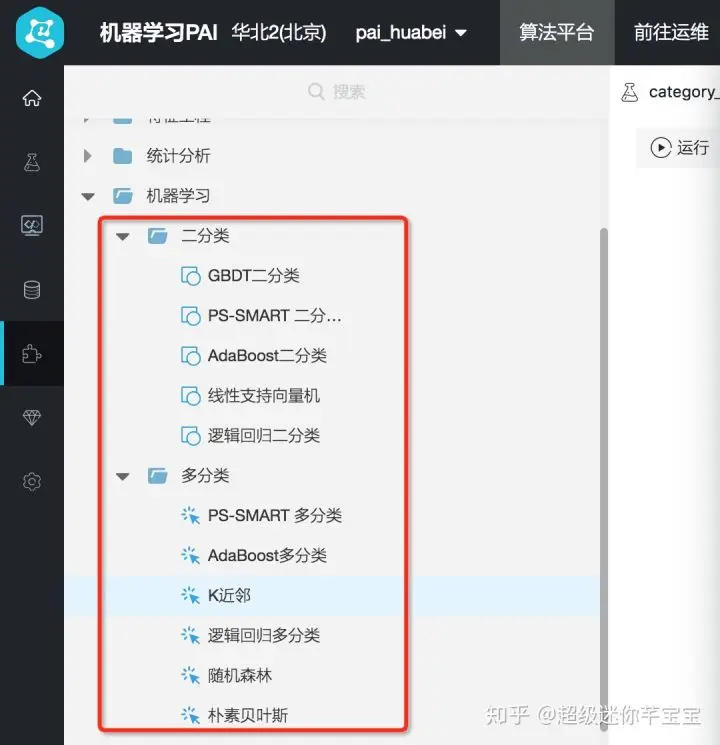 上面依次对常用的分类算法进行了介绍,PAI-Studio中也提供了相应的算法组件,如果想要使用,可以直接拖拽对应组件,配置相关参数即可。