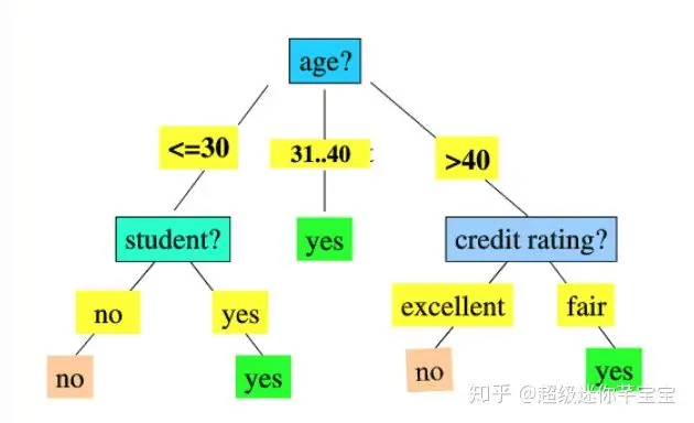 决策树,比较容易理解,以下图为例,根据某个人的特征(年龄、是否学生、信用情况)来进行分类,判断是否可以放贷款给他。生成的决策树如下图示。决策树思想,实际上就是寻找最纯净的划分方法,主要通过决策树的构造和剪枝。