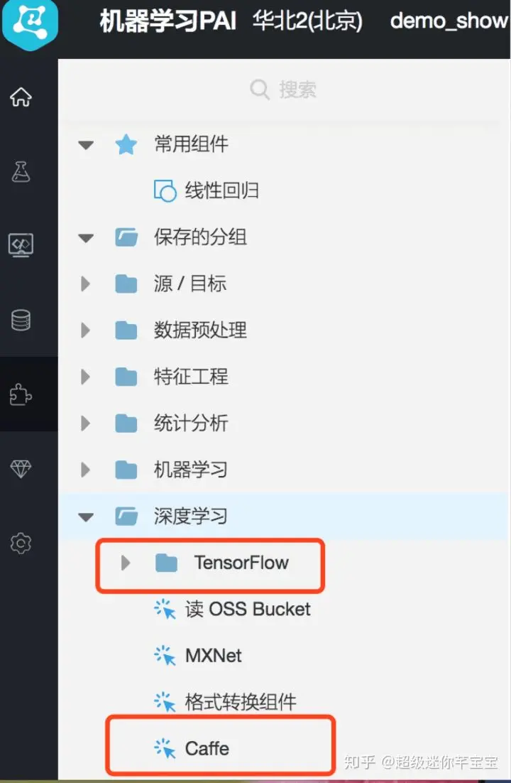 在PAI上想实现深度学习的解决方案,有两种方法,一种是利用PAI-Studio提供的框架Tensorflow和Caffee,在该组件上传入相应的python源码并配置相应输入输出和参数,即可利用阿里云背后支撑的资源进行深度学习的训练,如下图。