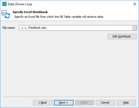 - 在对话框中,选择存储测试数据的Excel文件。在前面的一个步骤中,我们说我们将使用TestBook.xlsx文件。您可以在 \ Public \ Public Documents \ TestComplete 14 Samples \ Common \ Data-Driven Testing \文件夹中找到它。