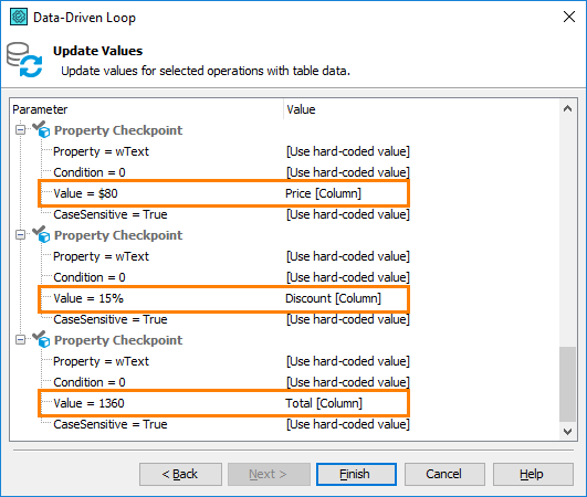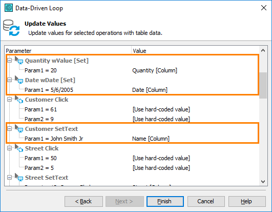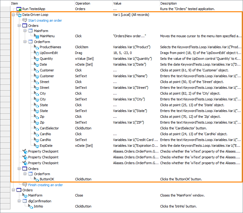 点击完成后,TestComplete将向记录的测试添加数据驱动循环操作,并将所选操作作为其子操作移动。此外,它还将使用“数据驱动循环”向导中指定的值更新已移动操作的参数。