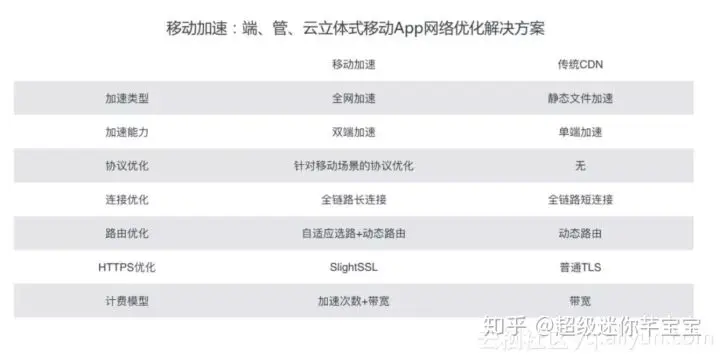 • 在“云”方面,传统CDN实现的功能是静态资源的缓存、分发能力,同样的移动加速会继承传统CDN静态资源缓存分发能力,同时对于像HTML、JS、CSS等面向Web化的资源也会进行动态的资源优化,进一步压缩链路上网络带宽的诉求,提升网络访问的效率。