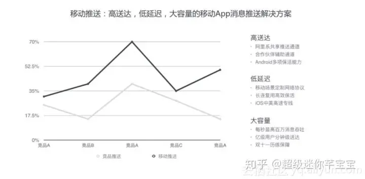 面向运营域,阿里巴巴会开放经历多年“双11”历练的消息推送系统。在送达方面开放整个阿里系共享的消息推送通道,结合厂商合作伙伴提供的基于多消息推送通道的通送解决方案保障整体送达效果。延迟方面,会针对移动网络场景进行深度优化和定制,同时面向IOS推送场景提供相应的中美高速通道专线,保障每一次任务的及时下发和网络秒级应答。在流量方面,每秒百万级别消息设备的吞吐率意味着在面对类似“双11”这样的强脉冲计算的场景下,也能够及时地对于推送业务进行应答。