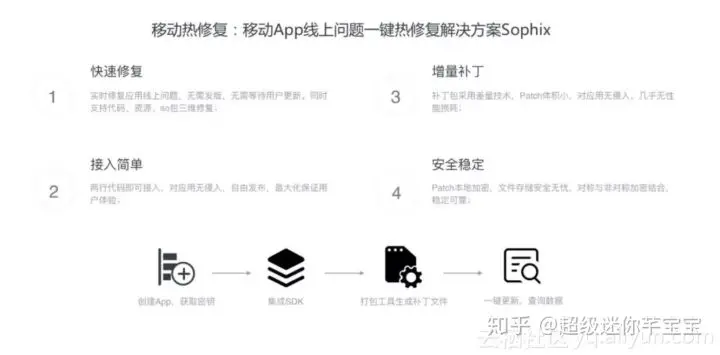 移动云面向移动App还推出了线上问题一键热修复的解决方案Sophix,针对Native App发版节奏慢,更新周期长的问题提供端到端一体化的热修复解决方案,Sophix可以面向代码、资源、SO文件三个维度进行修复,接入成本非常低廉,对应用没有侵入,几行代码可以完成整体接入,补丁包采用差量技术进行更新,从Patch生成、灰度、线上发布和统计能够帮助开发者实现一站式线上故障应急处理的解决方案。
