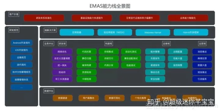 EMAS研发支撑平台覆盖从研发管理到持续集成、自动化测试、版本管理、灰度发布、监控大盘、系统运维、用户运营等完整的全流程生命周期管理,是移动互联网沉淀的这套流程、机制、方法论很重要的载体。同时配合在云上提供的移动中间件基础服务体系,可以从真正意义上面向开发者提供移动应用研发全栈解决方案。