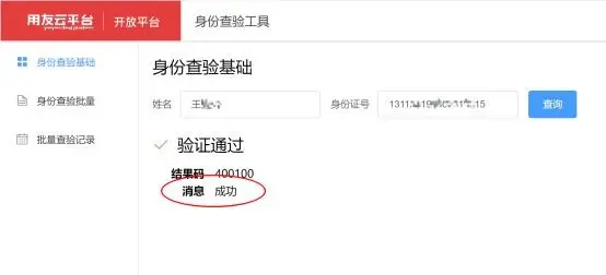 1. “身份查验基础”功能可以直接在线查询姓名与身份证是否一致,按提示输入要查验人的“姓名”和“身份证号”,点击“查询”就会返回验证消息。如下图所示:
