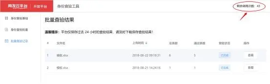 2. “批量查验记录”可以供大家查询历史查询记录,另外“剩余调用次数”会实时在页面的右上方更新,提醒查询人员及时购买和补充查询次数。