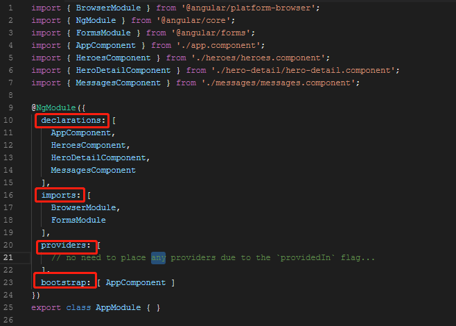 imports: [BrowserModule, SomeOtherModule](本模块所导入的模块列表。) -