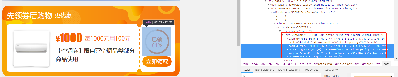 那么,要怎么去实现这样的样式呢?查了一下淘宝,PC端做了限制,无法直接查看手机端的优惠券效果;京东倒是上看到优惠券的样式,可都是直的,没什么难度。最后还是在苏宁上找到了类似的样式,发现是通过SVG来实现的。