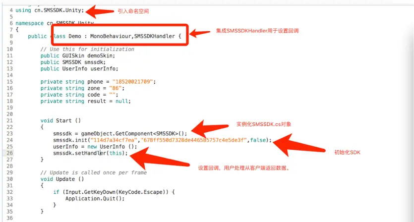 首先,要先引入命名空间,using cn.SMSSDK.Unity,并声明SMSSDK.cs的实例,如下:private SMSSDK smssdk,并且进行设置:smssdk = gameObject.GetComponet();