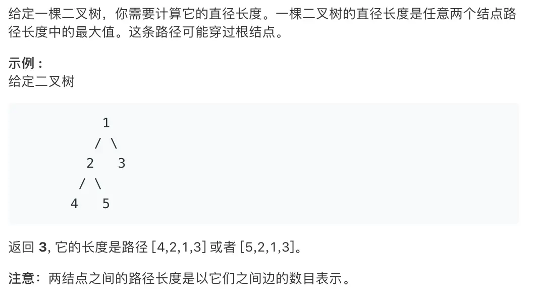 这道题与我的上一篇非常相似,leetcode 687--最长同值路径 可以对比着来看。由题目可见,在求最长路径时也是不能回溯的。抓住一个点理清递归函数内部逻辑,拿题目中2这个结点来看,需要把左右子树的最长路径分别求出来,分别为left,right,只要2结点的左子树不为空那么left+1,右子树不为空right+1。用一个全局变量cmax把当前最长路径保存起来,cmax=max(left+right,cmax),由于不能回溯计算路径长度,递归函数返回的只能是左右子树中最长路径的较大值,return max(left,right)。如果递归函数dfs(root==null),那肯定是return 0了,无需继续进行下面的语句。