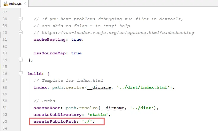 安装完毕后,更改congif/index.js文件中build下的assetsPublicPath属性值为"./"(默认为/)