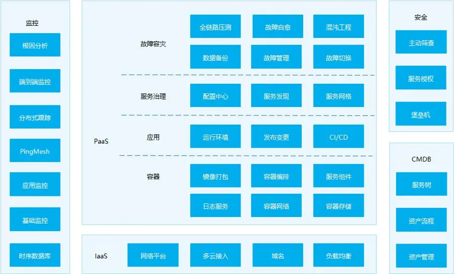 图示底部是IaaS层的各种资源及其管理平台,如网络管理、多云接入、域名、负载均衡等;