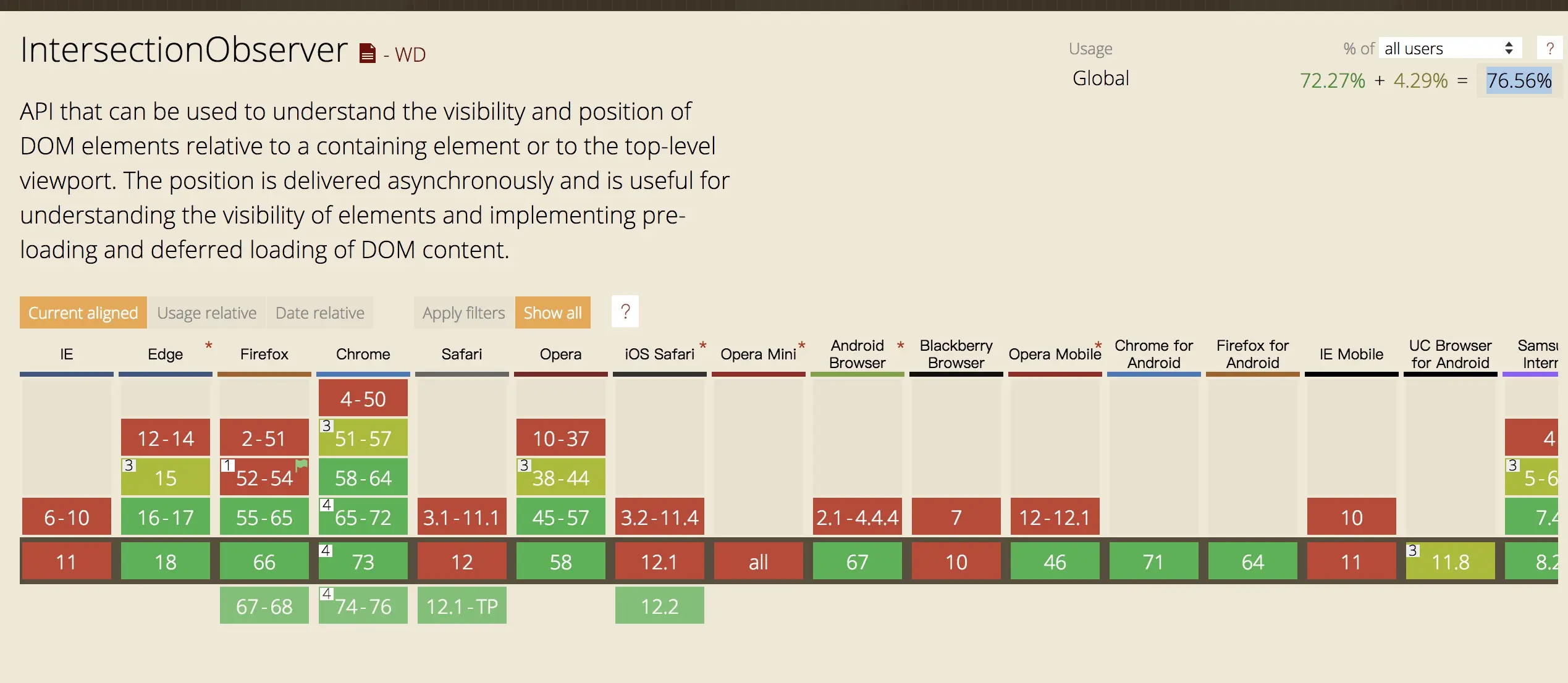 如今,Web为开发者提供了 IntersectionObserver 接口,它可以异步监听目标元素与其祖先或视窗的交叉状态,注意这个接口是异步的,它不随着目标元素的滚动同步触发,所以它并不会影响页面的滚动性能。