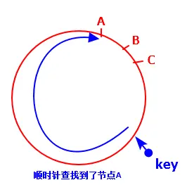 如下图的简单版本,假如总共有3个数据节点(A、B、C),当需要查找的数据的key经计算在A和B之间,则顺时针找,便找到了节点B。