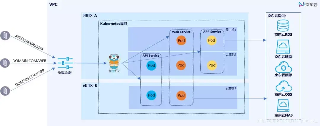 利用Traefik,并结合京东云Kubernetes集群及其他云服务(RDS,NAS,OSS,块存储等),可快速构建弹性扩展的微服务集群。