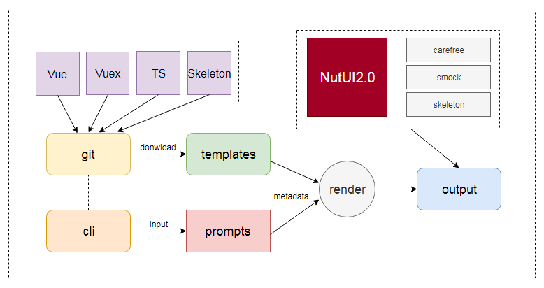 如上图所示,将不同场景的可直接运行的webpack模版代码放在 git 上维护,通过 nodejs 命令行交互方式获取用户配置项目信息和插件信息,通过 metadata 模版渲染方式,将模版和自定义部分相结合,最后输出用户需要的模版工程代码。
