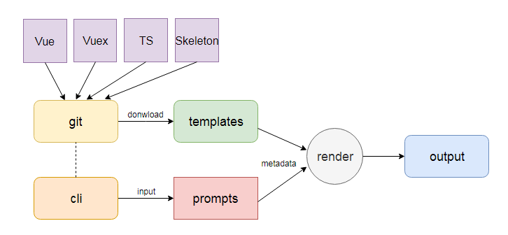 通过 download-git-repo 去 git 库下载模版集合。这里的 dev 分支存储了 vue 、 vuex 、 skeleton 、 typescript 四套模版。这里是统一全部都下载下来,然后根据命令行交互的信息进行筛选和处理。