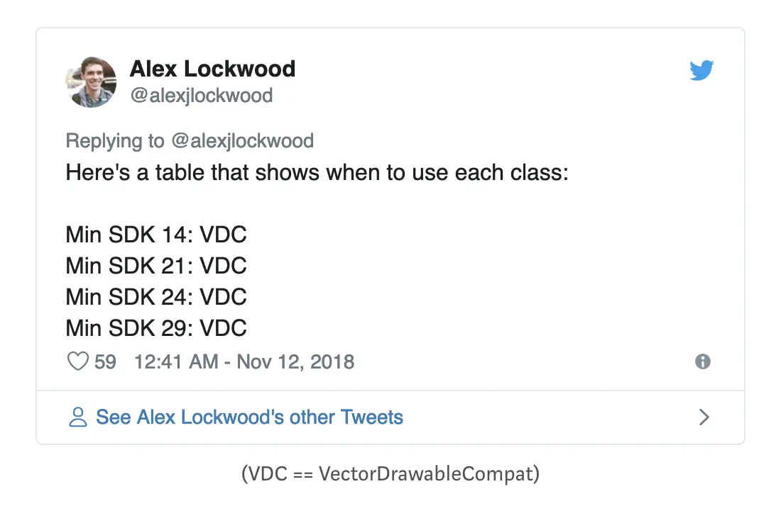 有时你需要在无法控制何时或如何加载的地方使用 drawable。例如:通知,主屏幕小部件或主题中指定的某些资源(例如,在创建预览窗口时设置由平台加载的 android:windowBackground)。在这些情况下,你不负责加载 drawable,因此没有机会集成 AndroidX 支持,你也就无法在 API 21 之前使用这些矢量资源了😞。