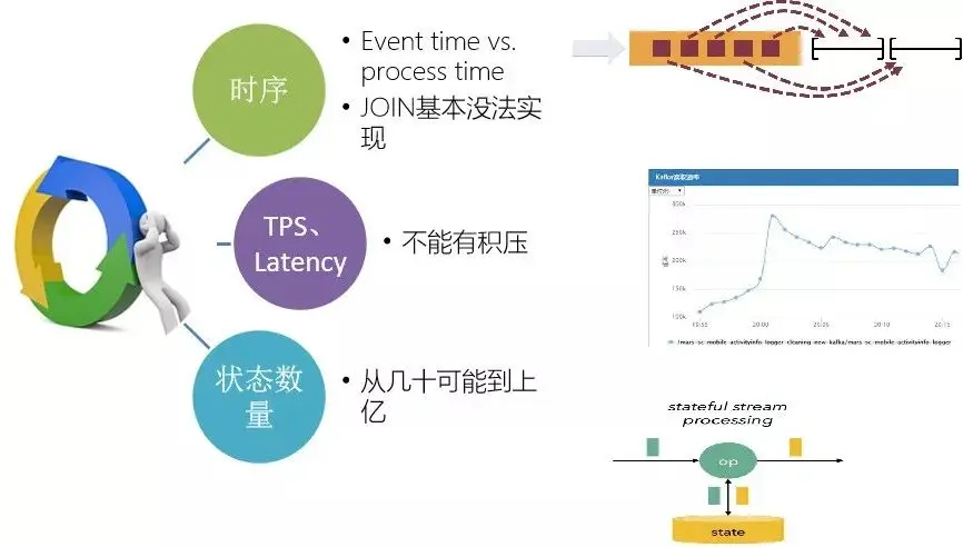 面对计算的结果和内部的计算中间结果数据,用什么来存储?中间是没有状态数据的,这状态数据如果量比较大,并且需要跟外部系统密切交互的时候,如果外部系统响应比较慢或者延迟比较高,就会严重影响实时处理的效率;
