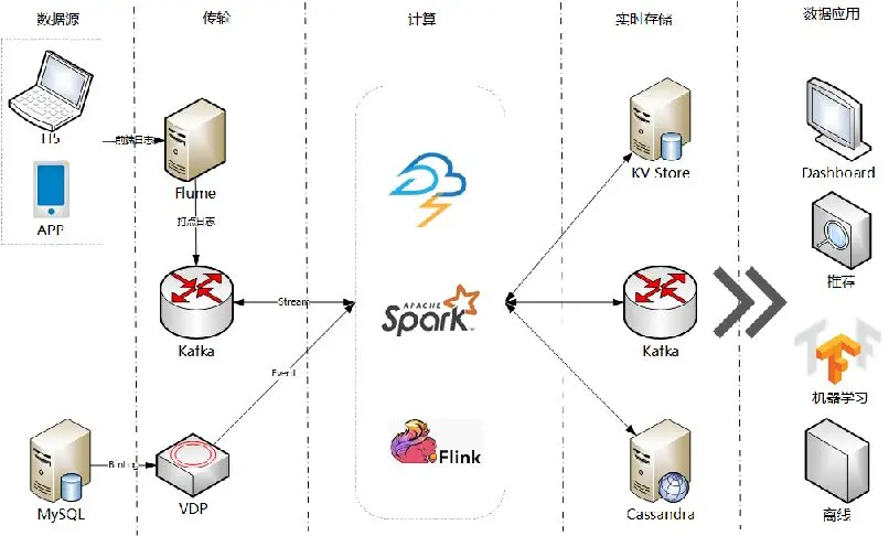 实时数据到达后,通过计算引擎完成业务逻辑的计算,以及和其他数据的交互,包括支持实时访问的存储系统。数据的结果可以给到实时报表、推荐引擎,也有给到机器学习平台进行模型训练。