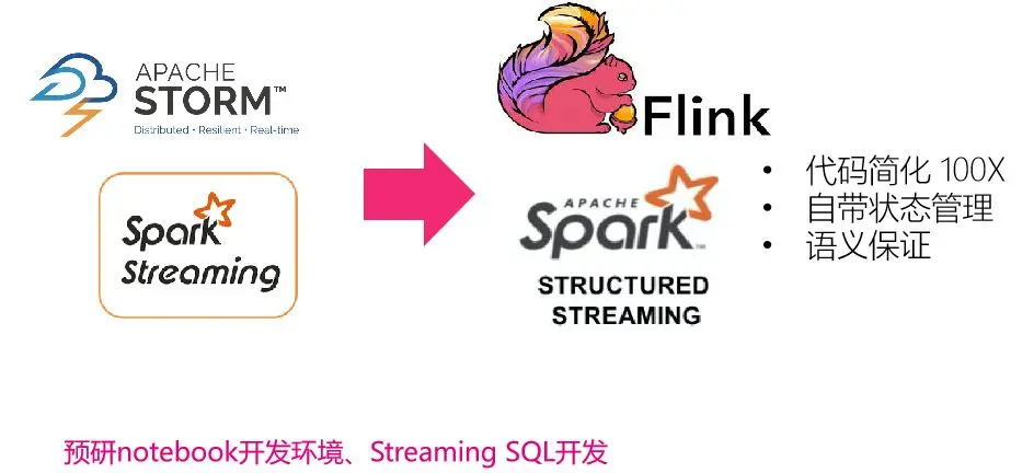 整个来说,开发平台也在预研实时的notebook开发环境,你可以完成相应的实时应用的开发,整个模式都是在替换Storm的节奏。