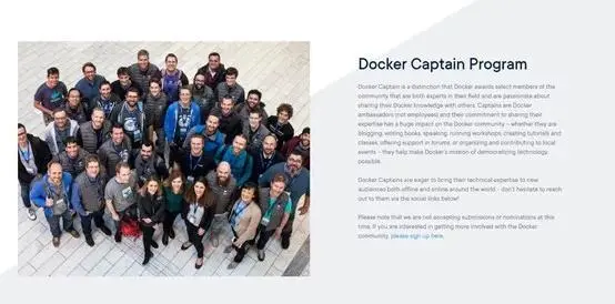 Docker Captain计划:Docker Captain是Docker官方颁发给社区中那些既精通各自领域又热衷于与他人分享Docker知识的成员的奖项。Captain和Docker专家分享他们的专业知识和经验,他们对Docker的发展产生了巨大的影响——无论是线上支持,还是线下活动——Docker技术的普及在他们的努力下成为可能。